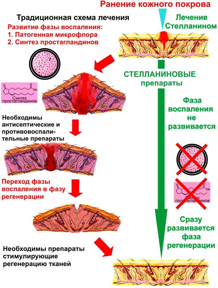 Существовавшие до настоящего времени препараты не могли решить главной проблемы: как ускорить механизм естественной (физиологической) регенерации. Стелланин смог справиться с этой задачей. Он НАПРЯМУЮ стимулирует восстановительные процессы, активирует рост сосудов и увеличивает энергетическую обеспеченность клеток и тканей. Проведенные при лечении пациентов исследования показали, что Стелланин в 2,4 раза ускоряет прорастание капилляров, в 7,5 раз увеличивает число фибробластов - основных клеток, участвующих в восстановлении повреждённого кожного покрова.